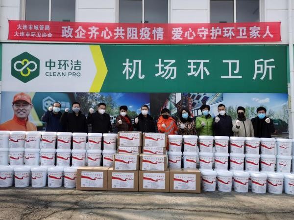2月18日,大連市城管局、大連市環衛協會、中環潔環境有限公司共同舉行“政企齊心共阻疫情,愛心守護環衛家人”防疫物資捐贈儀式,由市內四區環境衛生主管部門代表現場領取,隨后分發到各區環衛工人手中。