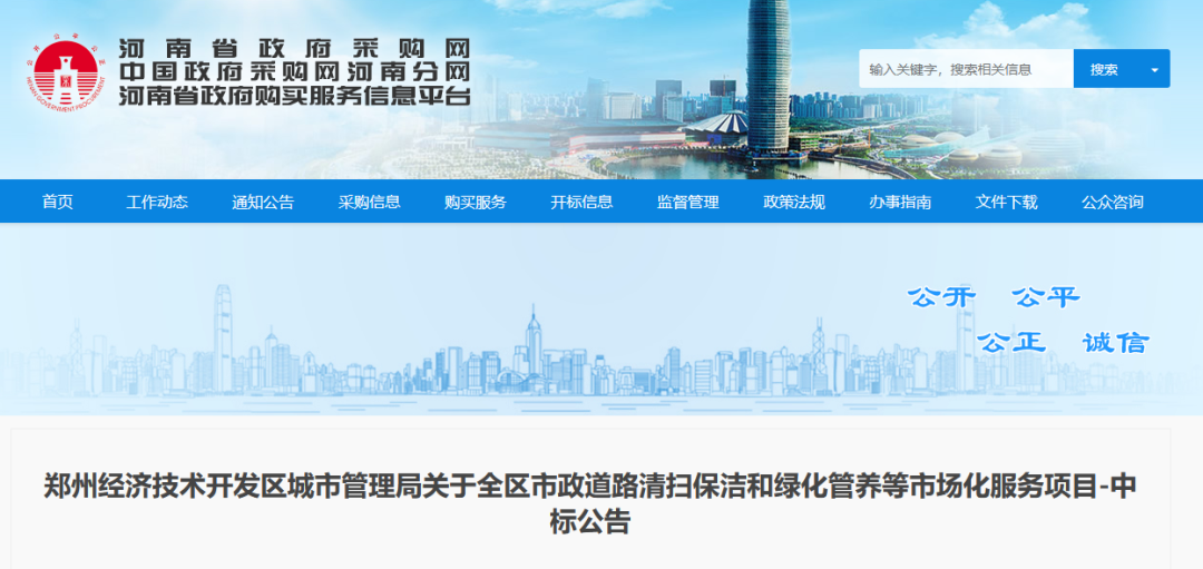 近日,鄭州經濟技術開發區市政道路清掃保潔和綠化管養等市場化服務項目公布中標結果,中環潔成功中標E包項目。項目中標金額1.66億元,服務年限3年,服務范圍包含機場高速、高鐵沿線、互通立交、生態廊道綠化及公園游園廣場綠化管養。